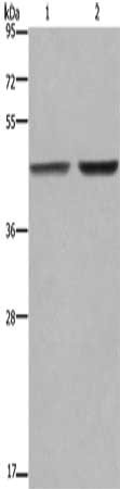 Gel: 8%SDS-PAGE, Lysate: 40 μg, Lane 1-2: MCF7 cells, 231 cells, Primary antibody: CSB-PA022040(GABPB2 Antibody) at dilution 1/550, Secondary antibody: Goat anti rabbit IgG at 1/8000 dilution, Exposure time: 1 minute
