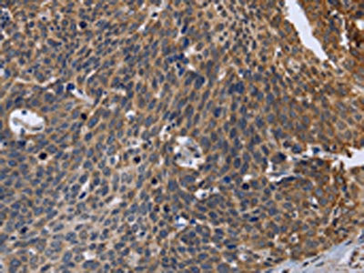The image is immunohistochemistry of paraffin-embedded Human cervical cancer tissue using CSB-PA449695(GABPB2 Antibody) at dilution 1/30. (Original magnification: ×200)