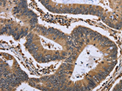 The image is immunohistochemistry of paraffin-embedded Human colon cancer tissue using CSB-PA212749(GADD45B Antibody) at dilution 1/30. (Original magnification: ×200)