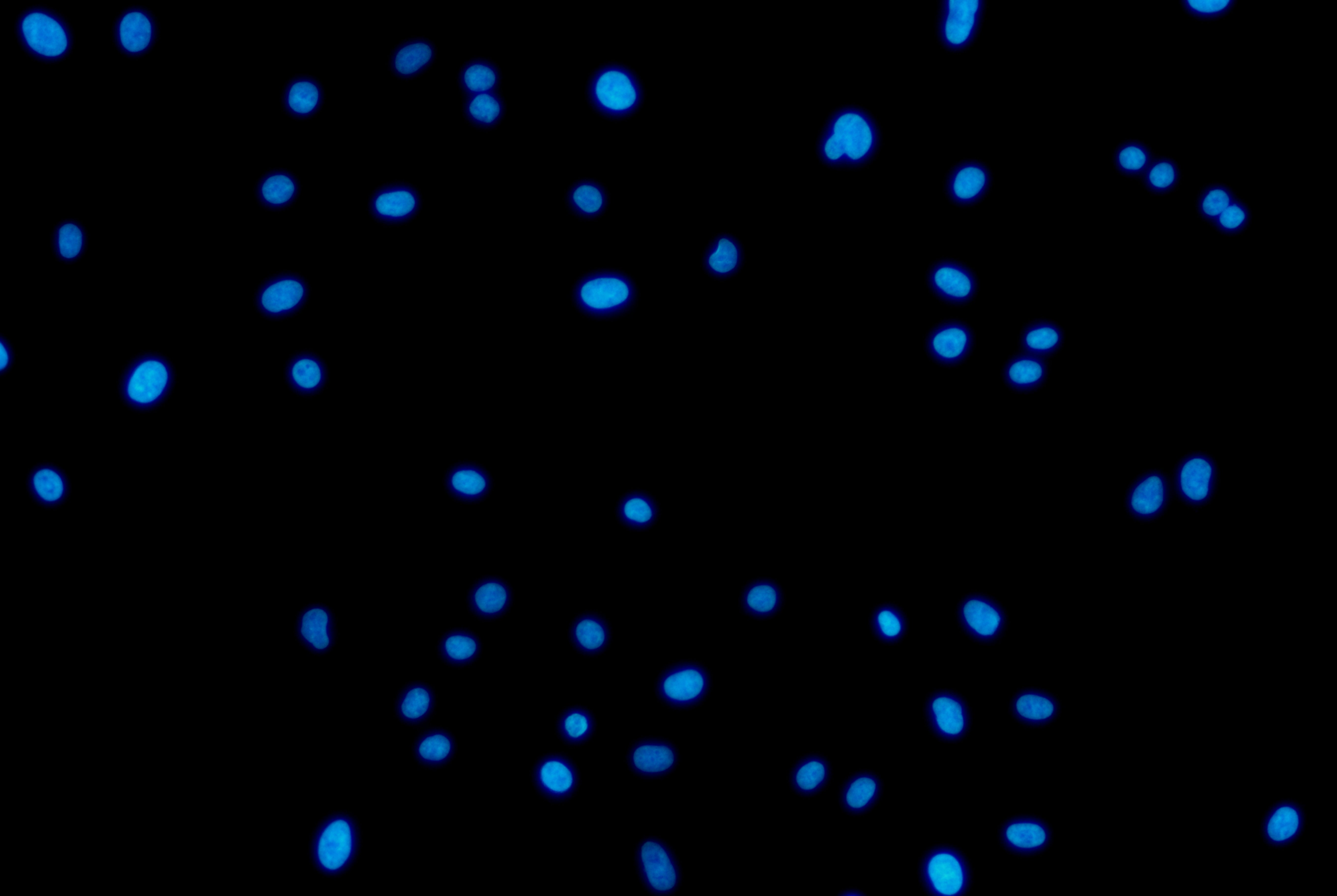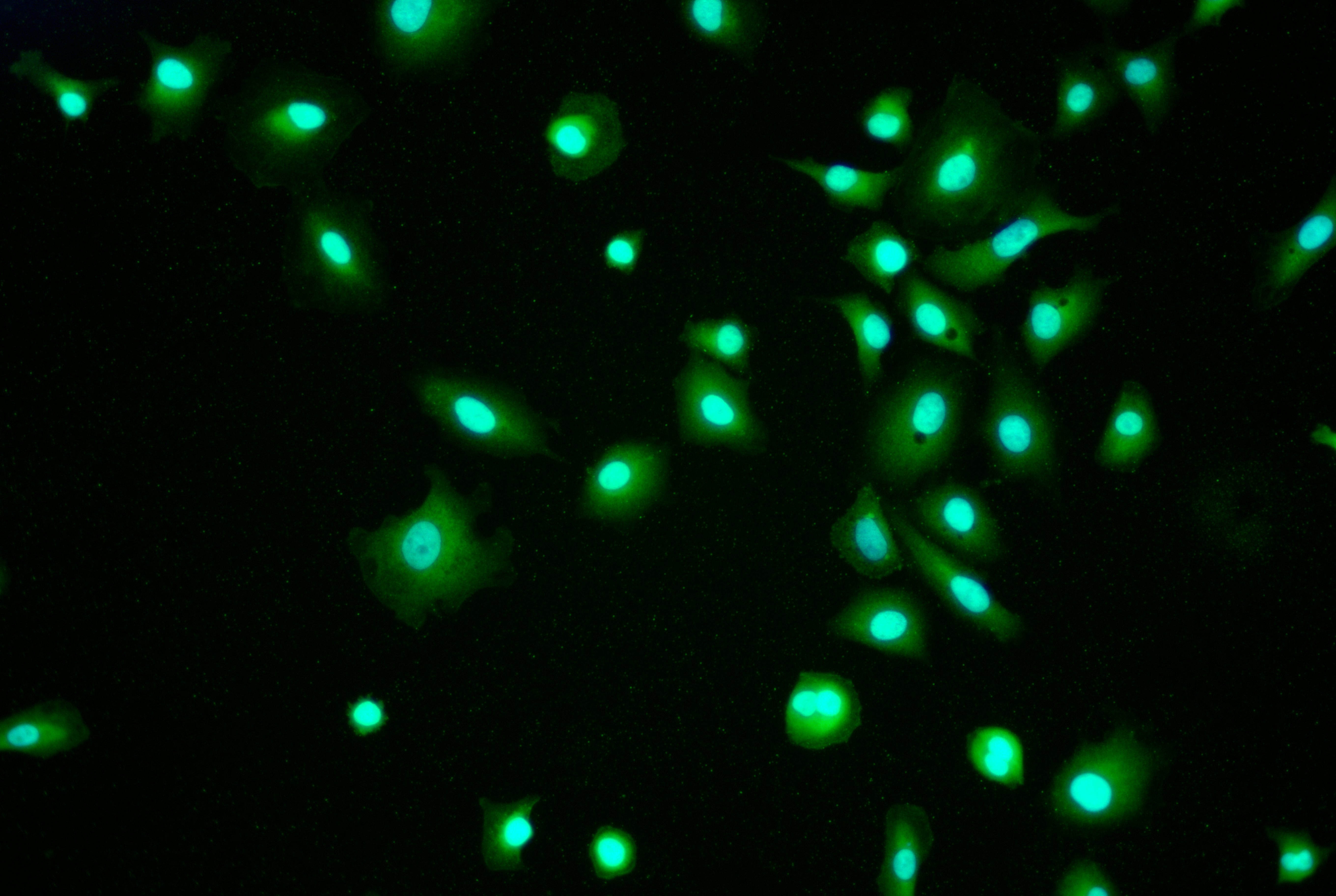 Immunofluorescence staining of A549 cell with 5% goat serum, counter-stained with DAPI. The cells were fixed in 4% formaldehyde and blocked in 10% normal Goat Serum. The cells were then incubated with the antibody overnight at 4C. The secondary antibody was Alexa Fluor 488-congugated AffiniPure Goat Anti-Rabbit IgG(H+L).