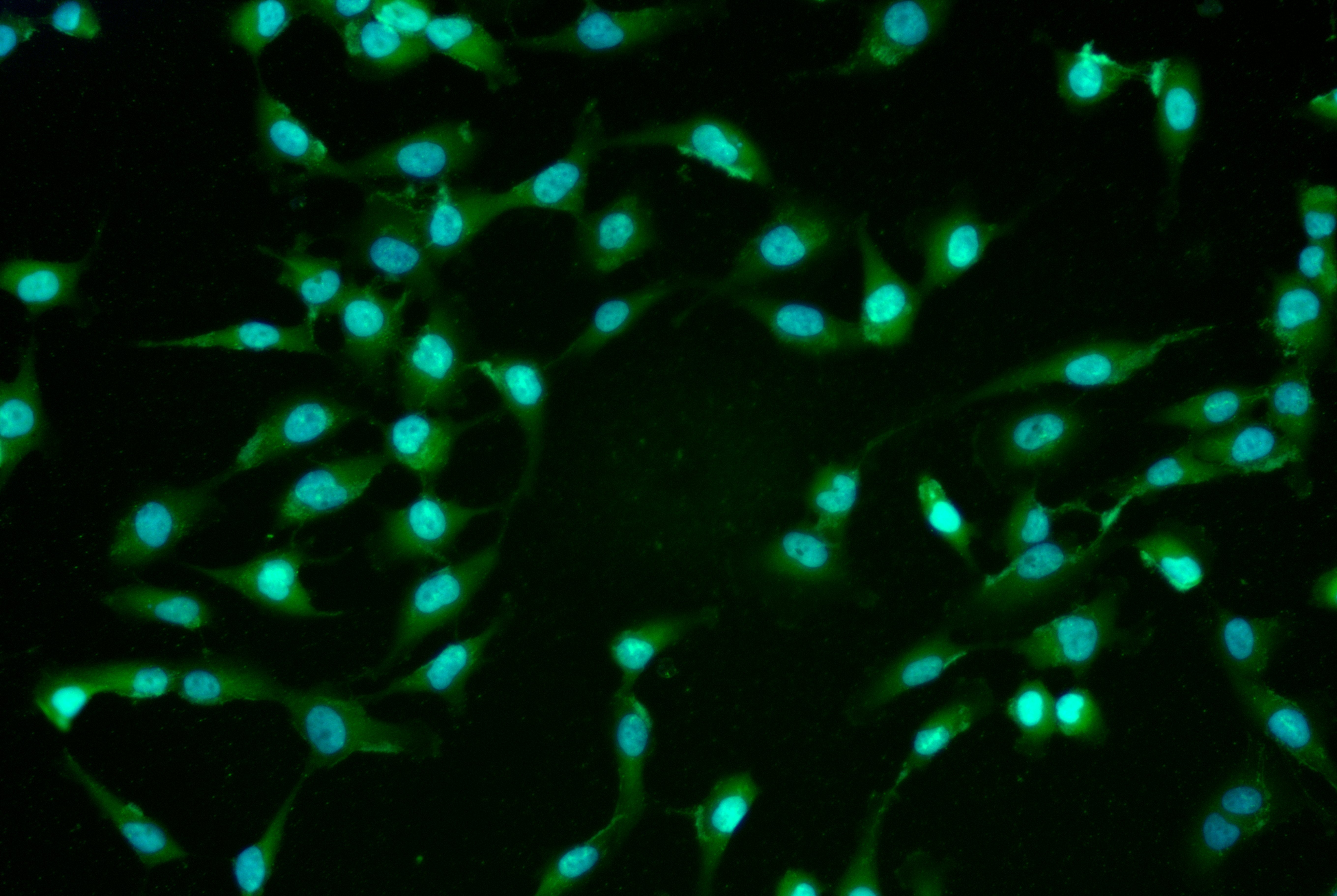 Immunofluorescence staining of U251 cell with 5% goat serum, counter-stained with DAPI. The cells were fixed in 4% formaldehyde and blocked in 10% normal Goat Serum. The cells were then incubated with the antibody overnight at 4C. The secondary antibody was Alexa Fluor 488-congugated AffiniPure Goat Anti-Rabbit IgG(H+L).