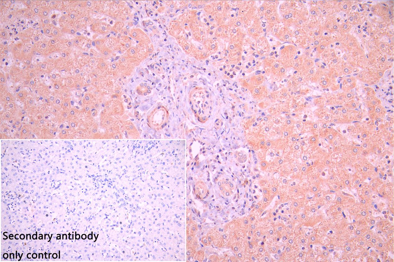 IHC image of CSB-PA009164DSR1HU diluted at 1:50 and staining in paraffin-embedded human Liver tissue performed on a Leica BondTM system. After dewaxing and hydration, antigen retrieval was mediated by high pressure in a citrate buffer (pH 6.0). Section was blocked with 10% normal goat serum 30min at RT. Then primary antibody (1% BSA) was incubated at 4°C overnight. The primary is detected by a Goat anti-rabbit polymer IgG labeled by HRP and visualized using 0.05% DAB. Secondary antibody only control: uses 1% BSA instead of primary antibody