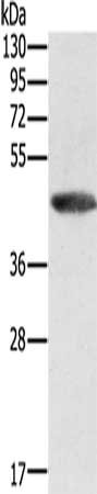 Gel: 8%SDS-PAGE, Lysate: 50 μg, Lane: Human fetal liver tissue, Primary antibody: CSB-PA063192(GALT Antibody) at dilution 1/200, Secondary antibody: Goat anti rabbit IgG at 1/8000 dilution, Exposure time: 1 minute