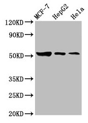 Positive WB detected in: MCF-7 whole cell lysate, HepG2 whole cell lysate, Hela whole cell lysate