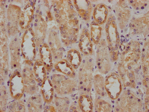 IHC image of CSB-PA754361LA01HU diluted at 1:200 and staining in paraffin-embedded human kidney tissue performed on a Leica BondTM system. After dewaxing and hydration, antigen retrieval was mediated by high pressure in a citrate buffer (pH 6.0). Section was blocked with 10% normal goat serum 30min at RT. Then primary antibody (1% BSA) was incubated at 4°C overnight. The primary is detected by a Goat anti-rabbit IgG labeled by HRP and visualized using 0.05% DAB.