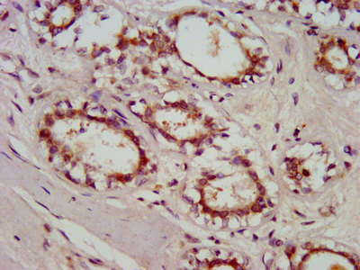 IHC image of CSB-PA853481LA01HU diluted at 1:800 and staining in paraffin-embedded human breast cancer performed on a Leica BondTM system. After dewaxing and hydration, antigen retrieval was mediated by high pressure in a citrate buffer (pH 6.0). Section was blocked with 10% normal goat serum 30min at RT. Then primary antibody (1% BSA) was incubated at 4°C overnight. The primary is detected by a biotinylated secondary antibody and visualized using an HRP conjugated SP system.
