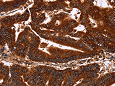 The image on the left is immunohistochemistry of paraffin-embedded Human colon cancer tissue using CSB-PA132284(GCKR Antibody) at dilution 1/50, on the right is treated with synthetic peptide. (Original magnification: ×200)