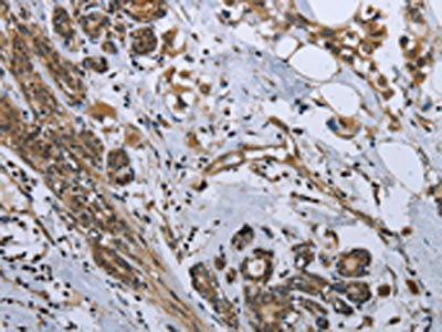 The image on the left is immunohistochemistry of paraffin-embedded Human breast cancer tissue using CSB-PA558316(GDF3 Antibody) at dilution 1/25, on the right is treated with fusion protein. (Original magnification: ×200)