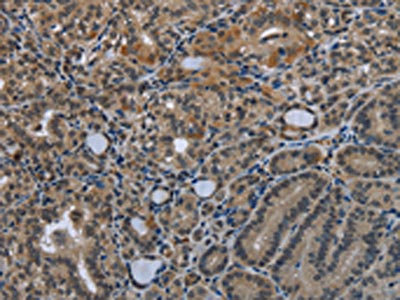 The image on the left is immunohistochemistry of paraffin-embedded Human thyroid cancer tissue using CSB-PA558316(GDF3 Antibody) at dilution 1/25, on the right is treated with fusion protein. (Original magnification: ×200)