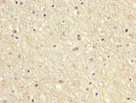 IHC image of CSB-PA01229A0Rb diluted at 1:200 and staining in paraffin-embedded human brain tissue performed on a Leica BondTM system. After dewaxing and hydration, antigen retrieval was mediated by high pressure in a citrate buffer (pH 6.0). Section was blocked with 10% normal goat serum 30min at RT. Then primary antibody (1% BSA) was incubated at 4°C overnight. The primary is detected by a biotinylated secondary antibody and visualized using an HRP conjugated SP system.