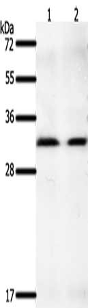 Gel: 10%SDS-PAGE, Lysate: 40 μg, Lane 1-2: K562 cells, hela cells, Primary antibody: CSB-PA871262(GEMIN2 Antibody) at dilution 1/400, Secondary antibody: Goat anti rabbit IgG at 1/8000 dilution, Exposure time: 2 minutes