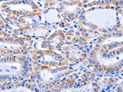 The image on the left is immunohistochemistry of paraffin-embedded Human thyroid cancer tissue using CSB-PA634274(GFER Antibody) at dilution 1/50, on the right is treated with fusion protein. (Original magnification: ×200)
