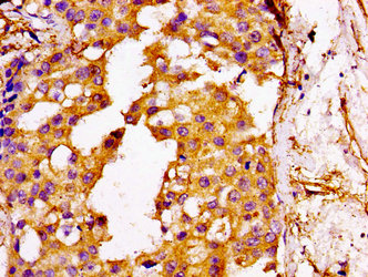 IHC image of CSB-PA009388LA01HU diluted at 1:100 and staining in paraffin-embedded human breast cancer performed on a Leica BondTM system. After dewaxing and hydration, antigen retrieval was mediated by high pressure in a citrate buffer (pH 6.0). Section was blocked with 10% normal goat serum 30min at RT. Then primary antibody (1% BSA) was incubated at 4°C overnight. The primary is detected by a biotinylated secondary antibody and visualized using an HRP conjugated SP system.