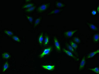 Immunofluorescence staining of HepG2 cells with CSB-PA872487LA01HU at 1:133, counter-stained with DAPI. The cells were fixed in 4% formaldehyde, permeabilized using 0.2% Triton X-100 and blocked in 10% normal Goat Serum. The cells were then incubated with the antibody overnight at 4°C. The secondary antibody was Alexa Fluor 488-congugated AffiniPure Goat Anti-Rabbit IgG(H+L).
