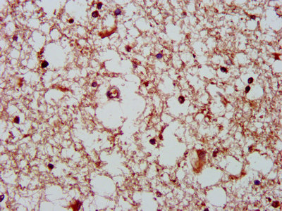 IHC image of CSB-PA872487LA01HU diluted at 1:400 and staining in paraffin-embedded human brain tissue performed on a Leica BondTM system. After dewaxing and hydration, antigen retrieval was mediated by high pressure in a citrate buffer (pH 6.0). Section was blocked with 10% normal goat serum 30min at RT. Then primary antibody (1% BSA) was incubated at 4°C overnight. The primary is detected by a biotinylated secondary antibody and visualized using an HRP conjugated SP system.