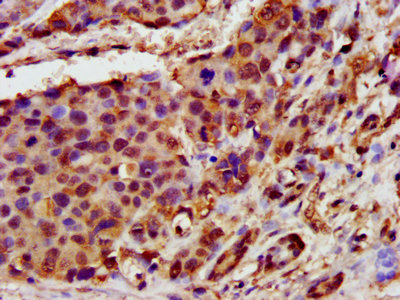 IHC image of CSB-PA872487LA01HU diluted at 1:400 and staining in paraffin-embedded human pancreatic cancer performed on a Leica BondTM system. After dewaxing and hydration, antigen retrieval was mediated by high pressure in a citrate buffer (pH 6.0). Section was blocked with 10% normal goat serum 30min at RT. Then primary antibody (1% BSA) was incubated at 4°C overnight. The primary is detected by a biotinylated secondary antibody and visualized using an HRP conjugated SP system.