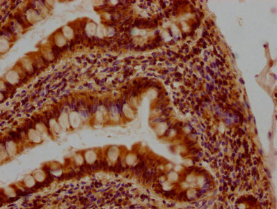 IHC image of CSB-PA009434PA01HU diluted at 1:400 and staining in paraffin-embedded human small intestine tissue performed on a Leica BondTM system. After dewaxing and hydration, antigen retrieval was mediated by high pressure in a citrate buffer (pH 6.0). Section was blocked with 10% normal goat serum 30min at RT. Then primary antibody (1% BSA) was incubated at 4°C overnight. The primary is detected by a biotinylated secondary antibody and visualized using an HRP conjugated SP system.
