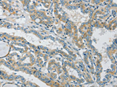 The image on the left is immunohistochemistry of paraffin-embedded Human thyroid cancer tissue using CSB-PA078531(GJC1 Antibody) at dilution 1/50, on the right is treated with synthetic peptide. (Original magnification: ×200)