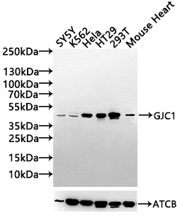 Western Blot Positive WB detected in: SY5Y whole cell lysate(30μg), K562 whole cell lysate(30μg), Hela whole cell lysate(30μg), HT29 whole cell lysate(30μg),293T whole cell lysate(30μg),Mouse Heart tissue lysate30μg) All lanes: GJC1 antibody at 1:1000 Secondary Goat polyclonal to rabbit IgG at 1/20000 dilution Predicted band size: 49 kDa Observed band size: 49 kDa Exposure time: 30s