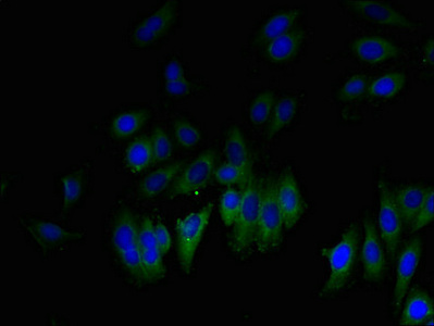 Immunofluorescent analysis of HepG2 cells using CSB-PA009503LA01HU at dilution of 1:100 and Alexa Fluor 488-congugated AffiniPure Goat Anti-Rabbit IgG(H+L)
