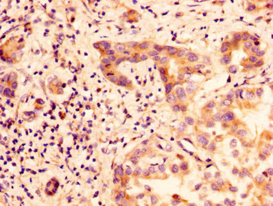 IHC image of CSB-PA009503LA01HU diluted at 1:100 and staining in paraffin-embedded human liver cancer performed on a Leica BondTM system. After dewaxing and hydration, antigen retrieval was mediated by high pressure in a citrate buffer (pH 6.0). Section was blocked with 10% normal goat serum 30min at RT. Then primary antibody (1% BSA) was incubated at 4°C overnight. The primary is detected by a biotinylated secondary antibody and visualized using an HRP conjugated SP system.