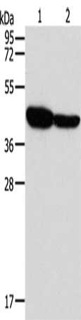 Gel: 10%SDS-PAGE, Lysate: 40 μg, Lane 1-2: Mouse brain tissue, Human fetal brain tissue, Primary antibody: CSB-PA870318(GLRA1 Antibody) at dilution 1/500, Secondary antibody: Goat anti rabbit IgG at 1/8000 dilution, Exposure time: 1 minute
