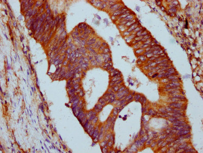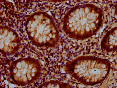 IHC image of CSB-PA769767LA01HU diluted at 1:500 and staining in paraffin-embedded human colon cancer performed on a Leica BondTM system. After dewaxing and hydration, antigen retrieval was mediated by high pressure in a citrate buffer (pH 6.0). Section was blocked with 10% normal goat serum 30min at RT. Then primary antibody (1% BSA) was incubated at 4°C overnight. The primary is detected by a biotinylated secondary antibody and visualized using an HRP conjugated SP system.