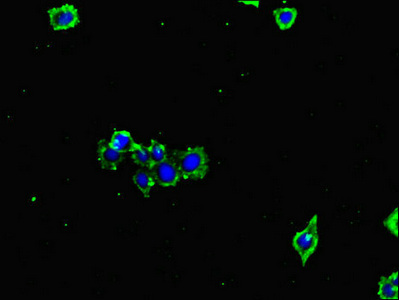 Immunofluorescent analysis of HepG2 cells using CSB-PA009553LA01HU at dilution of 1:100 and Alexa Fluor 488-congugated AffiniPure Goat Anti-Rabbit IgG(H+L)
