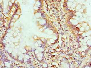 Immunohistochemistry of paraffin-embedded human small intestine tissue using CSB-PA009582ESR2HU at dilution of 1:100