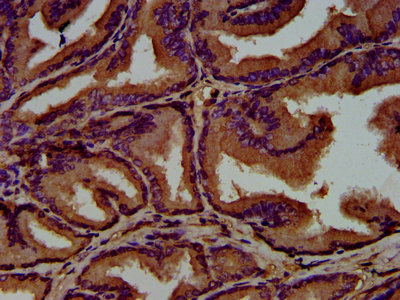 IHC image of CSB-PA009592LA01HU diluted at 1:500 and staining in paraffin-embedded human prostate tissue performed on a Leica BondTM system. After dewaxing and hydration, antigen retrieval was mediated by high pressure in a citrate buffer (pH 6.0). Section was blocked with 10% normal goat serum 30min at RT. Then primary antibody (1% BSA) was incubated at 4°C overnight. The primary is detected by a biotinylated secondary antibody and visualized using an HRP conjugated SP system.