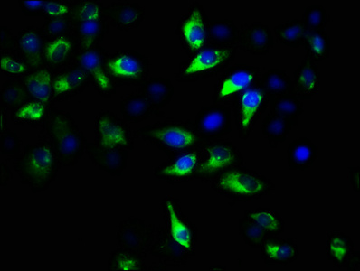 Immunofluorescence staining of Hela cells with CSB-PA009599LA01HU at 1:167, counter-stained with DAPI. The cells were fixed in 4% formaldehyde, permeabilized using 0.2% Triton X-100 and blocked in 10% normal Goat Serum. The cells were then incubated with the antibody overnight at 4°C. The secondary antibody was Alexa Fluor 488-congugated AffiniPure Goat Anti-Rabbit IgG(H+L).
