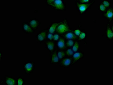 Immunofluorescence staining of Hela cells with CSB-PA009600LA01HU at 1:166, counter-stained with DAPI. The cells were fixed in 4% formaldehyde, permeabilized using 0.2% Triton X-100 and blocked in 10% normal Goat Serum. The cells were then incubated with the antibody overnight at 4°C. The secondary antibody was Alexa Fluor 488-congugated AffiniPure Goat Anti-Rabbit IgG(H+L).