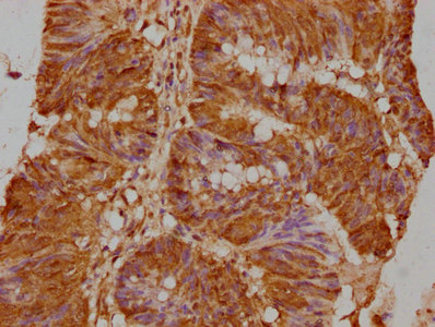 IHC image of CSB-PA009600LA01HU diluted at 1:500 and staining in paraffin-embedded human colon cancer performed on a Leica BondTM system. After dewaxing and hydration, antigen retrieval was mediated by high pressure in a citrate buffer (pH 6.0). Section was blocked with 10% normal goat serum 30min at RT. Then primary antibody (1% BSA) was incubated at 4°C overnight. The primary is detected by a biotinylated secondary antibody and visualized using an HRP conjugated SP system.