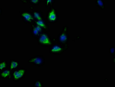 Immunofluorescence staining of U251 cells with CSB-PA009614OA01HU at 1:50, counter-stained with DAPI. The cells were fixed in 4% formaldehyde, permeabilized using 0.2% Triton X-100 and blocked in 10% normal Goat Serum. The cells were then incubated with the antibody overnight at 4°C. The secondary antibody was Alexa Fluor 488-congugated AffiniPure Goat Anti-Rabbit IgG(H+L).