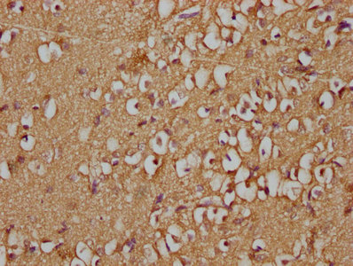 IHC image of CSB-PA009614OA01HU diluted at 1:100 and staining in paraffin-embedded human brain tissue performed on a Leica BondTM system. After dewaxing and hydration, antigen retrieval was mediated by high pressure in a citrate buffer (pH 6.0). Section was blocked with 10% normal goat serum 30min at RT. Then primary antibody (1% BSA) was incubated at 4°C overnight. The primary is detected by a biotinylated secondary antibody and visualized using an HRP conjugated SP system.