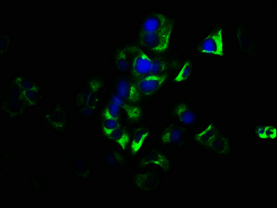Immunofluorescence staining of MCF-7 cells with CSB-PA009619LA01HU at 1:133, counter-stained with DAPI. The cells were fixed in 4% formaldehyde, permeabilized using 0.2% Triton X-100 and blocked in 10% normal Goat Serum. The cells were then incubated with the antibody overnight at 4°C. The secondary antibody was Alexa Fluor 488-congugated AffiniPure Goat Anti-Rabbit IgG(H+L).