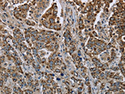 The image on the left is immunohistochemistry of paraffin-embedded Human liver cancer tissue using CSB-PA147812(GOT2 Antibody) at dilution 1/50, on the right is treated with fusion protein. (Original magnification: ×200)