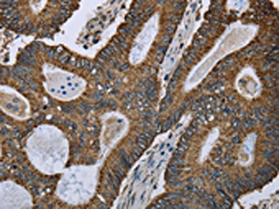 The image on the left is immunohistochemistry of paraffin-embedded Human colon cancer tissue using CSB-PA147812(GOT2 Antibody) at dilution 1/50, on the right is treated with fusion protein. (Original magnification: ×200)