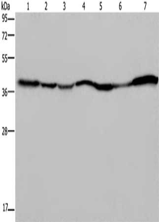 Gel: 10%SDS-PAGE, Lysate: 40 μg, Lane 1-7: 293T cells, Hela cells, Human fetal liver tissue, mouse spleen tissue, Mouse heart tissue, human fetal brain tissue, hepatocellular carcinoma tissue, Primary antibody: CSB-PA147812(GOT2 Antibody) at dilution 1/400, Secondary antibody: Goat anti rabbit IgG at 1/8000 dilution, Exposure time: 10 seconds