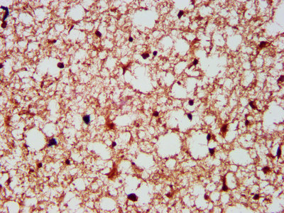 IHC image of CSB-PA009716LA01HU diluted at 1:300 and staining in paraffin-embedded human brain tissue performed on a Leica BondTM system. After dewaxing and hydration, antigen retrieval was mediated by high pressure in a citrate buffer (pH 6.0). Section was blocked with 10% normal goat serum 30min at RT. Then primary antibody (1% BSA) was incubated at 4°C overnight. The primary is detected by a biotinylated secondary antibody and visualized using an HRP conjugated SP system.