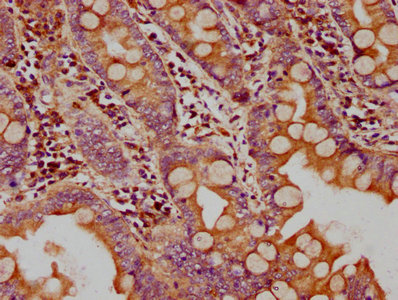 IHC image of CSB-PA009726LA01HU diluted at 1:400 and staining in paraffin-embedded human small intestine tissue performed on a Leica BondTM system. After dewaxing and hydration, antigen retrieval was mediated by high pressure in a citrate buffer (pH 6.0). Section was blocked with 10% normal goat serum 30min at RT. Then primary antibody (1% BSA) was incubated at 4°C overnight. The primary is detected by a biotinylated secondary antibody and visualized using an HRP conjugated SP system.