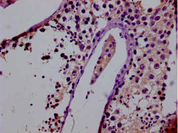 IHC image of CSB-PA722571LA01HU diluted at 1:50 and staining in paraffin-embedded human testis tissue performed on a Leica BondTM system. After dewaxing and hydration, antigen retrieval was mediated by high pressure in a citrate buffer (pH 6.0). Section was blocked with 10% normal goat serum 30min at RT. Then primary antibody (1% BSA) was incubated at 4°C overnight. The primary is detected by a biotinylated secondary antibody and visualized using an HRP conjugated SP system.
