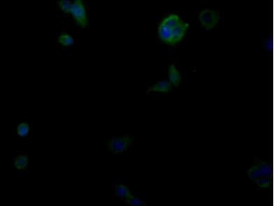 Immunofluorescence staining of PC-3 cells with CSB-PA722571LA01HU at 1:100, counter- stained with DAPI. The cells were fixed in 4% formaldehyde, permeabilized using 0.2% Triton X-100 and blocked in 10% normal Goat Serum. The cells were then incubated with the antibody overnight at 4°C. The secondary antibody was Alexa Fluor 488-congugated AffiniPure Goat Anti-Rabbit IgG(H+L).