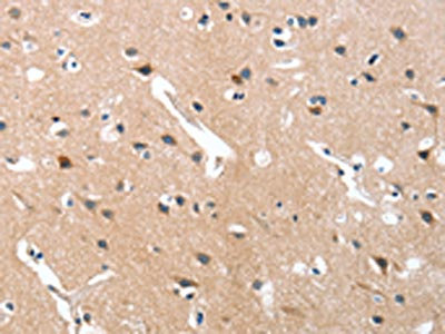 The image on the left is immunohistochemistry of paraffin-embedded Human brain tissue using CSB-PA228050(GRB7 Antibody) at dilution 1/40, on the right is treated with fusion protein. (Original magnification: ×200)