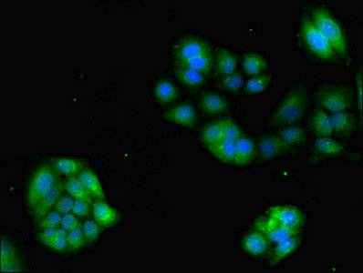 Immunofluorescent analysis of PC-3 cells using CSB-PA009925LA01HU at dilution of 1:100 and Alexa Fluor 488-congugated AffiniPure Goat Anti-Rabbit IgG(H+L)