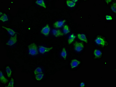 Immunofluorescence staining of Hela cells with CSB-PA622790LA01HU at 1:50, counter-stained with DAPI. The cells were fixed in 4% formaldehyde, permeabilized using 0.2% Triton X-100 and blocked in 10% normal Goat Serum. The cells were then incubated with the antibody overnight at 4°C. The secondary antibody was Alexa Fluor 488-congugated AffiniPure Goat Anti-Rabbit IgG(H+L).