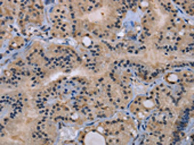 The image on the left is immunohistochemistry of paraffin-embedded Human thyroid cancer tissue using CSB-PA962258(GSN Antibody) at dilution 1/40, on the right is treated with synthetic peptide. (Original magnification: ×200)