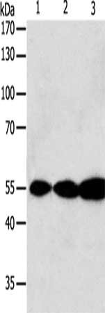 Gel: 10%SDS-PAGE, Lysate: 40 μg, Lane 1-3: Jurkat cells, Hela cells, A549 cells, Primary antibody: CSB-PA910911(GSR Antibody) at dilution 1/750, Secondary antibody: Goat anti rabbit IgG at 1/8000 dilution, Exposure time: 30 seconds