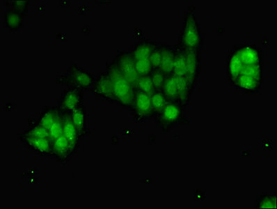 Immunofluorescent analysis of PC-3 cells using CSB-PA010001HA01HU at dilution of 1:100 and Alexa Fluor 488-congugated AffiniPure Goat Anti-Rabbit IgG(H+L)