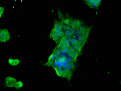 Immunofluorescence staining of 293 cells with CSB-PA010031LA01HU at 1:166, counter-stained with DAPI. The cells were fixed in 4% formaldehyde, permeabilized using 0.2% Triton X-100 and blocked in 10% normal Goat Serum. The cells were then incubated with the antibody overnight at 4°C. The secondary antibody was Alexa Fluor 488-congugated AffiniPure Goat Anti-Rabbit IgG(H+L).